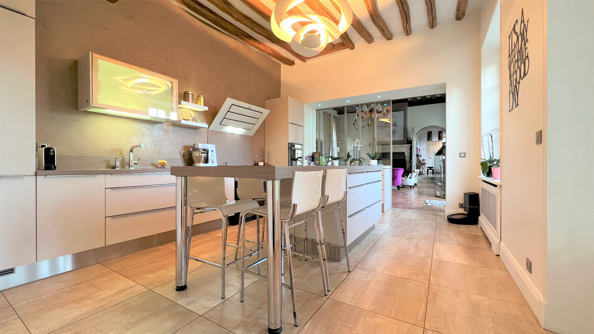 Une magnifique verrière au tons muscade laisse apparaitre une spacieuse cuisine de plus de 20 m², équipée de meubles aux tons clairs, d'un piano de cuisine Lacanche et d'un plan de travail en céramistone du plus bel effet